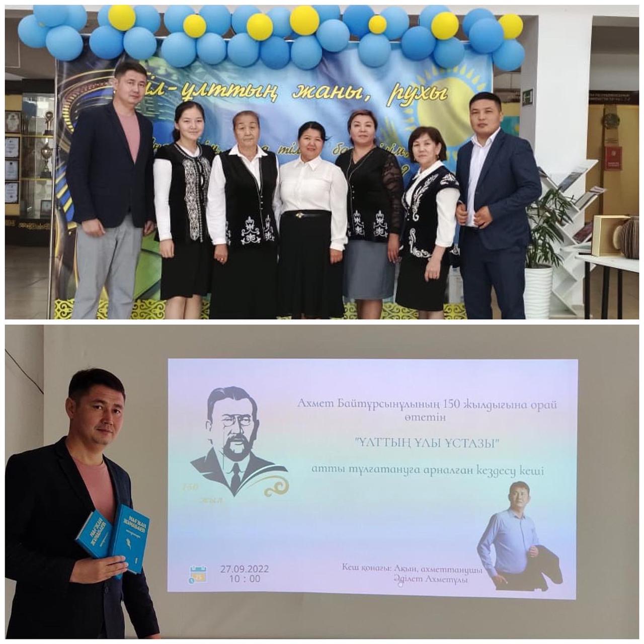 27 қыркүйек күні, мектебіміздегі «Қазақ тілі мен әдебиеті» әдістемелік бірлестігінің онкүндігі аясында Ахмет Байтұрсынұлының 150 жылдығына орай 9-10 сынып оқушыларымен «Ұлттың ұлы ұстазы» атты тұлғатануға арналған кездесу кеші өтті. Кештің басты қонағы М.Әуезов атындағы әдебиет және өнер институтының қызметкері, ахметтанушы, ақын Әділет Ахметұлы болды. Кездесу барысында Әділет Ахметұлы Ұлт ұстазының әр жылдары басылып шыққан кітаптарының ерекшеліктерімен таныстыра отырып А.Байтұрсынұлының ұлттық ғылымды қалыптастыру жолындағы қосқан үлесін, еселі еңбегін түсіндіріп дәріс оқыды.
