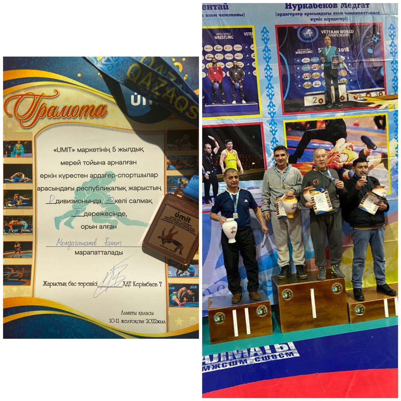 Молдагожанов Галым, учитель физкультуры Наурызбайского района, города Алматы, «Общеобразовательной школы № 186 им. С. Копбаева», занял место в категории «Д», III степени среди спортсменов-ветеранов по вольной борьбе.