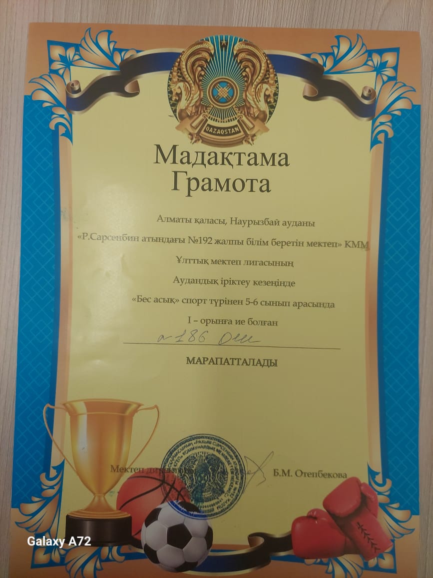 Алматы қаласы, Наурызбай ауданы," Р.Сарсенбин атындағы 192 жалпы білім беретін мектеп " коммуналдық мемлекеттік мекемесінде Ұлттық мектеп лигасының аудандық іріктеу кезеңінде "Бес асық " спорт түрінен 5-6 сынып арасында 1- орынға №186 жалпы білім беретін мектеп оқушылары ие болды. Құттықтаймыз!