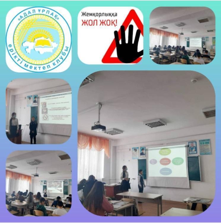 С.Көпбаев атындағы №186 жалпы білім беретін мектебінде 18 қараша күні Адал ұрпақ еріктілер клубының жетекшісі: 9ә сынып оқушысы Ерғалиева Ақбота ұйым мүшелеріне "Жемқорлыққа жол жоқ" атты жиналыс өткізді.