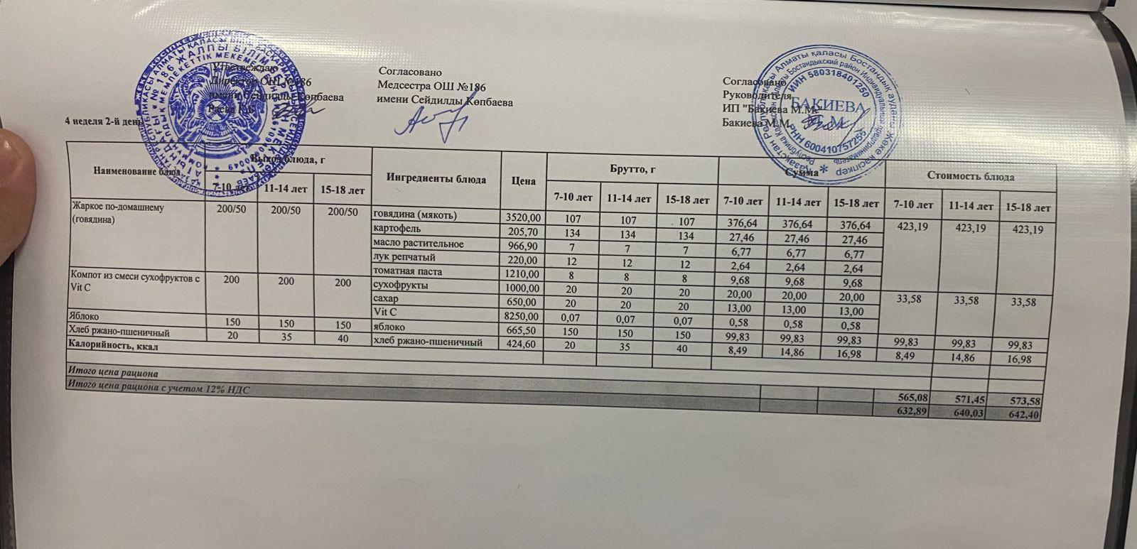 Тамақтандыру ас мәзірі / меню блюд 15/09/2022
