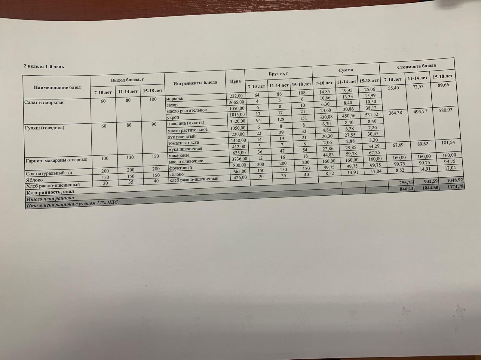 Тамақтану ас мәзірі / Меню блюд 01.09.2021