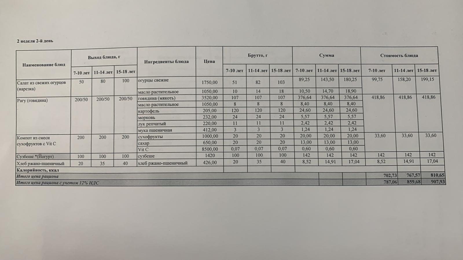 Тамақтандыру ас мәзірі / меню блюд 15/09/2022